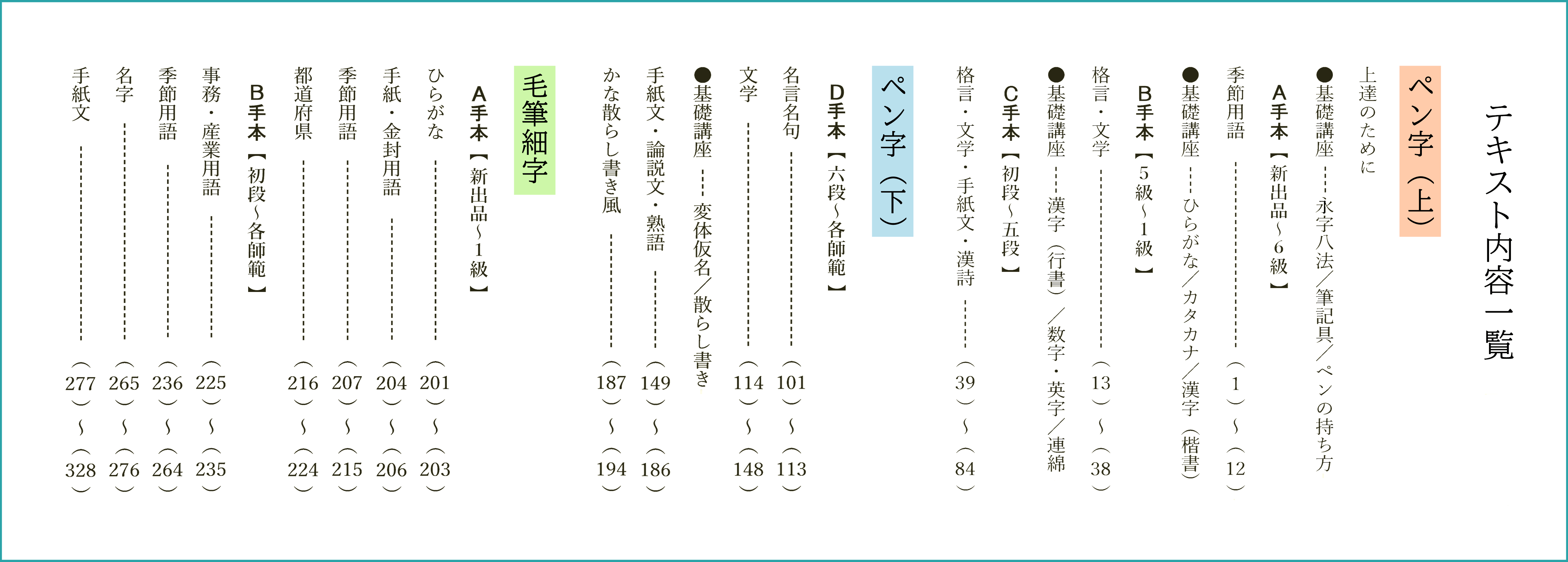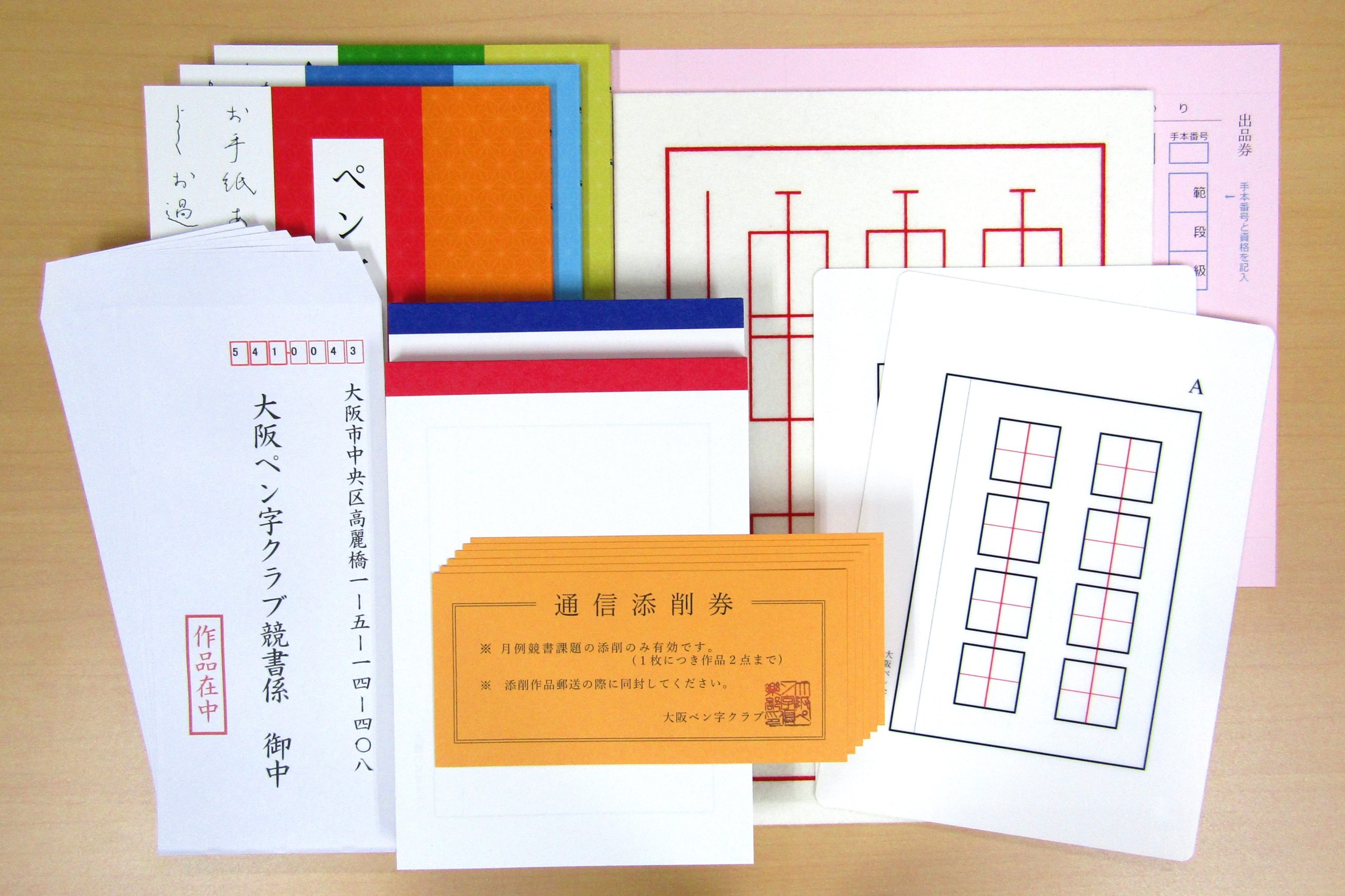 ペン字(上)1冊・競書用紙4冊・出品券12枚1セット・下敷き1種・作品送付用封筒半年分・通信添削セット半年分・送料