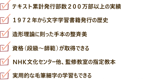 昭和47年(1972年)創立以来、美しく習い易い素直な文字造形が支持され、多くの教育現場でご使用いただいてきたテキストの集大成版です。