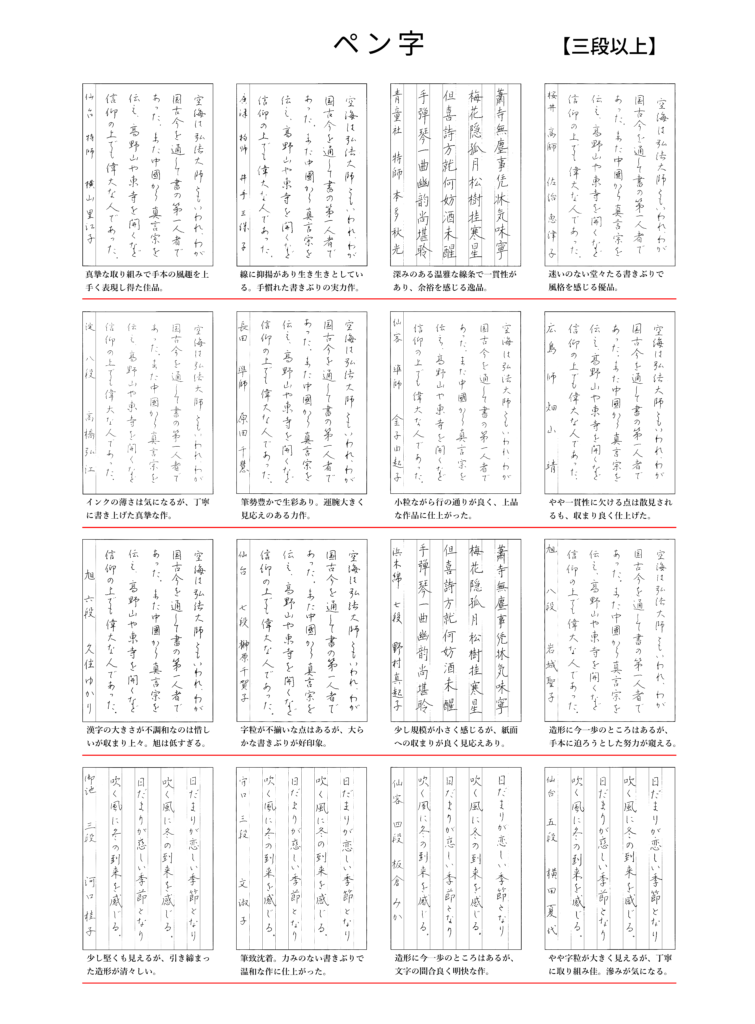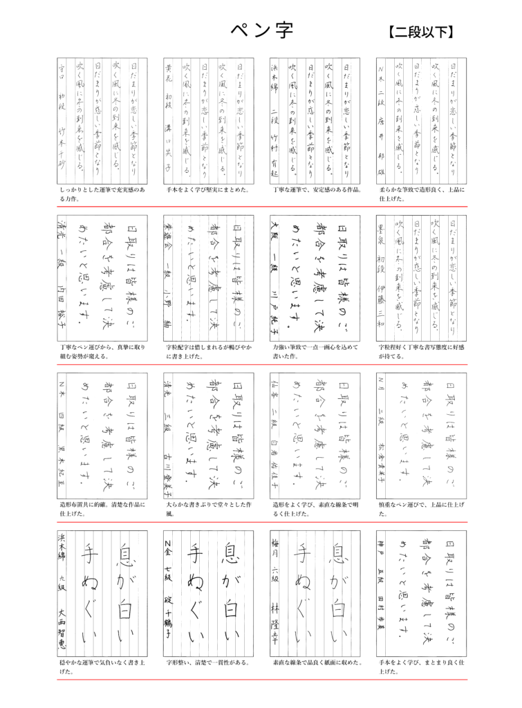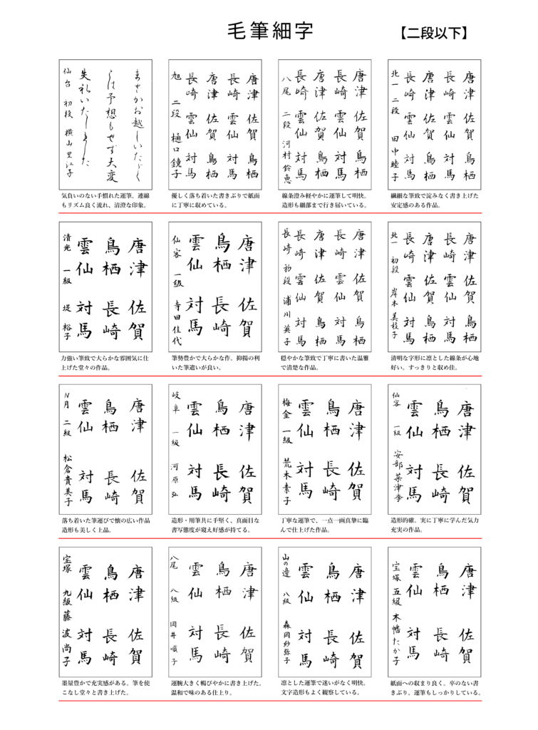 2025年11月出品優秀作品優秀作品 2025年11月号課題の優秀作品です。 「大阪ペン字クラブのペン字と毛筆細字の通信講座。大阪府大阪市中央区の有限会社書法が発行するテキストは、格調高い書風で多くの支持を得ています。書道教室を併設し、直接指導も行っております。クセ字でお悩みの方、資格を取りたい方にお勧めです。」