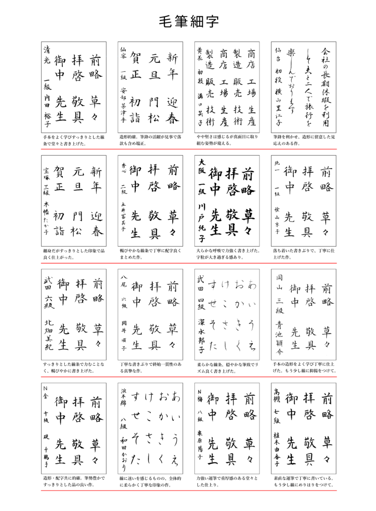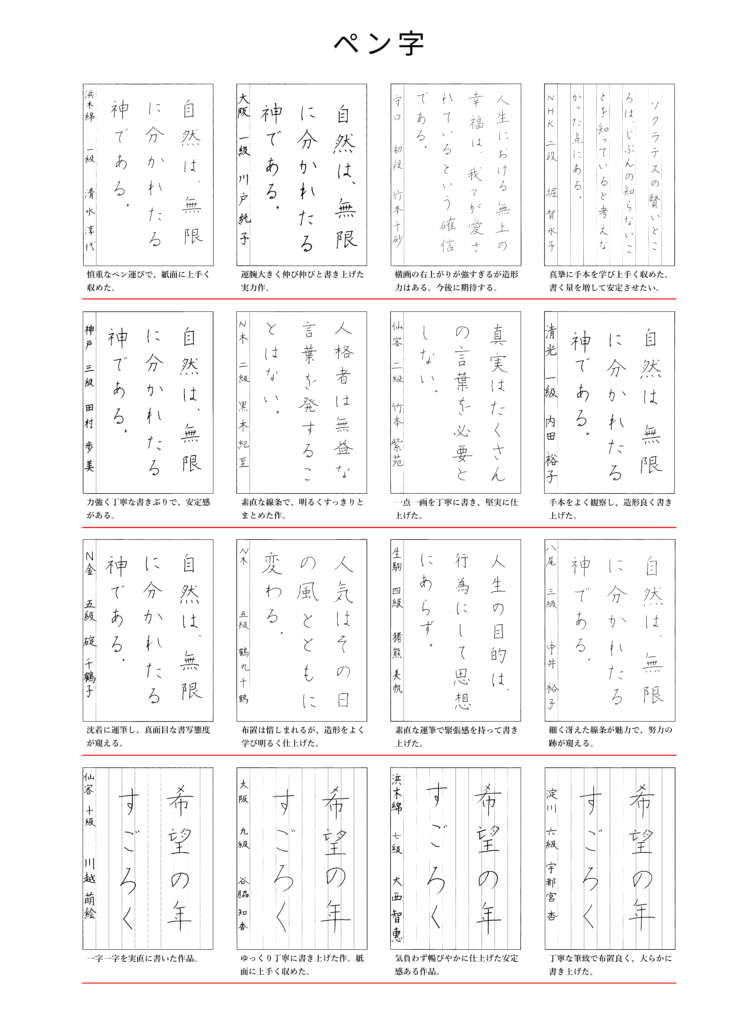 2026年1月出品優秀作品優秀作品 2026年1月出品の優秀作品です。 「大阪ペン字クラブのペン字と毛筆細字の通信講座。大阪府大阪市中央区の有限会社書法が発行するテキストは、格調高い書風で多くの支持を得ています。書道教室を併設し、直接指導も行っております。クセ字でお悩みの方、資格を取りたい方にお勧めです。」