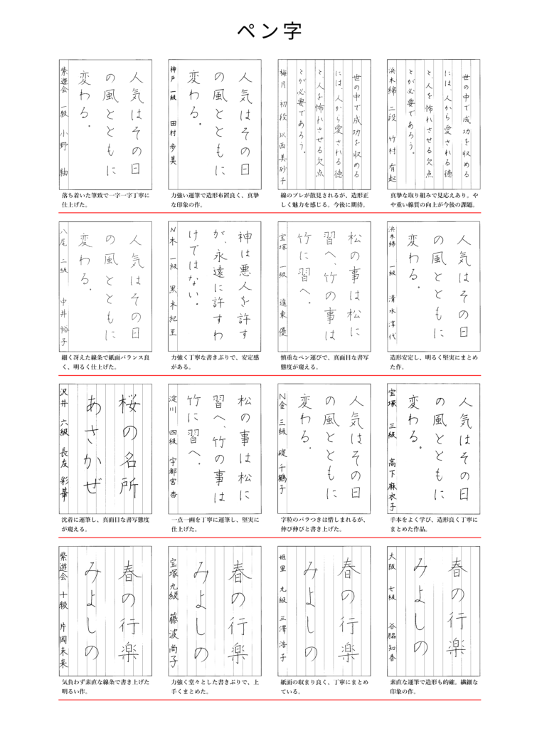 2026年3月出品優秀作品優秀作品 2026年3月出品の優秀作品です。 「大阪ペン字クラブのペン字と毛筆細字の通信講座。大阪府大阪市中央区の有限会社書法が発行するテキストは、格調高い書風で多くの支持を得ています。書道教室を併設し、直接指導も行っております。クセ字でお悩みの方、資格を取りたい方にお勧めです。」