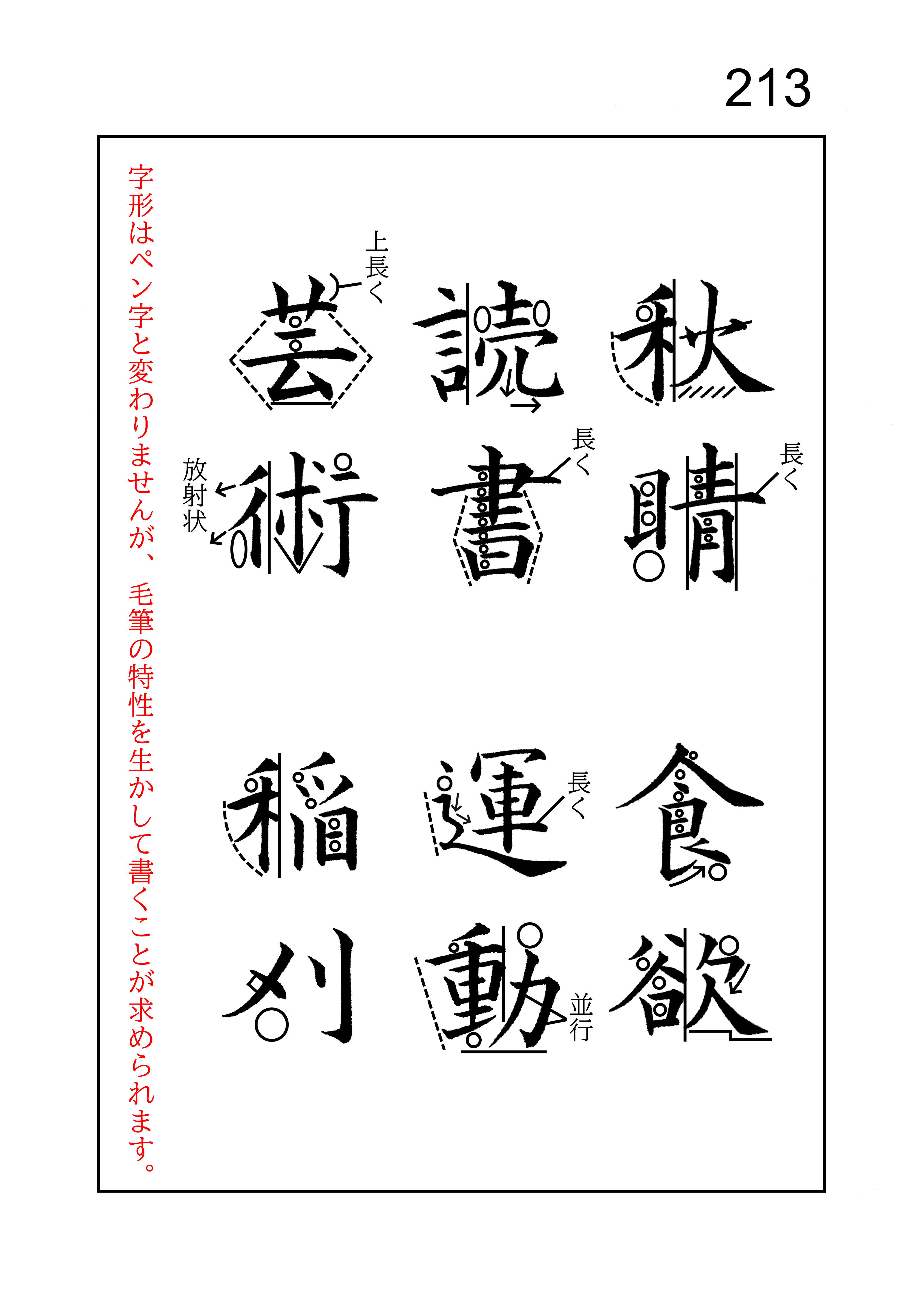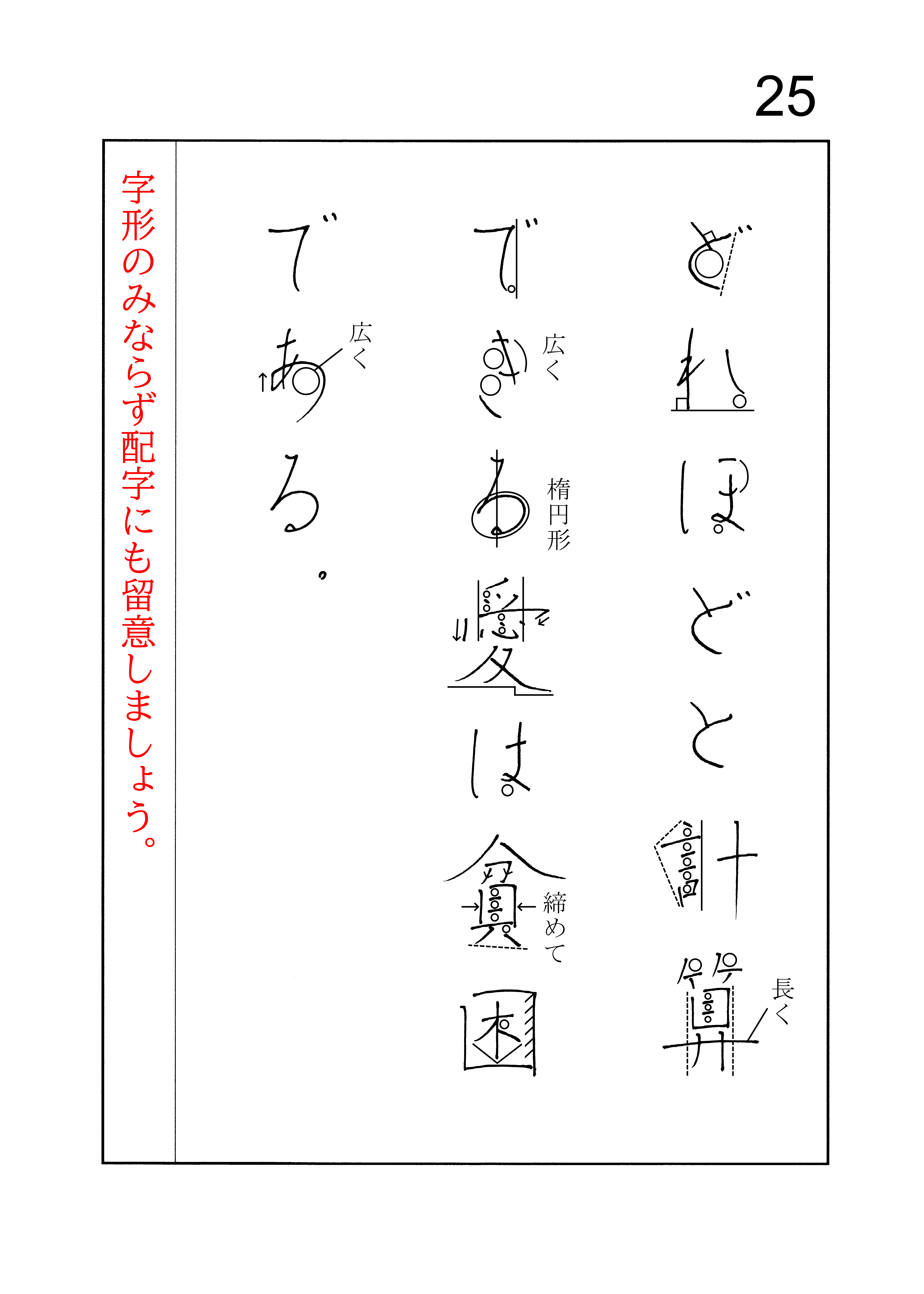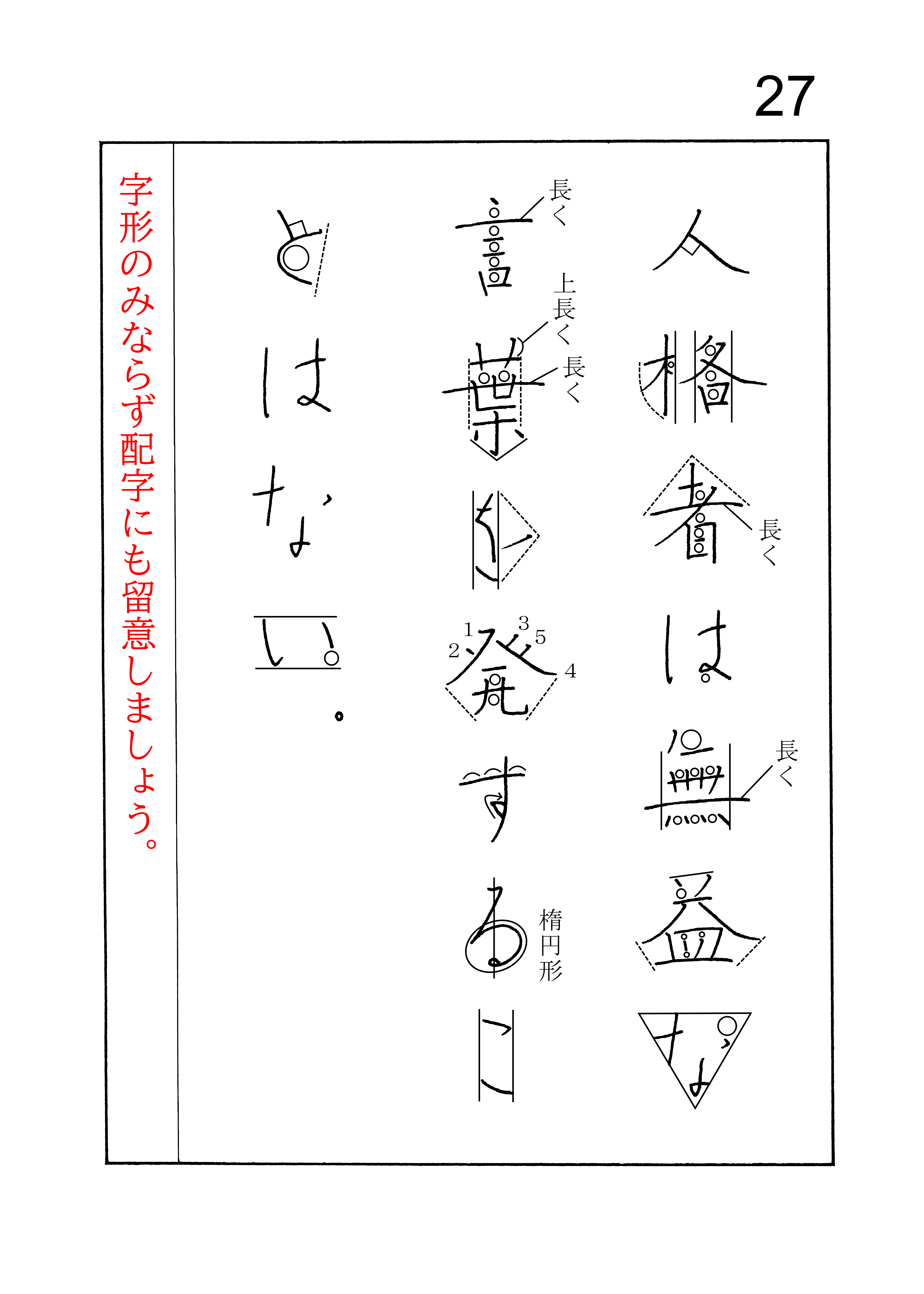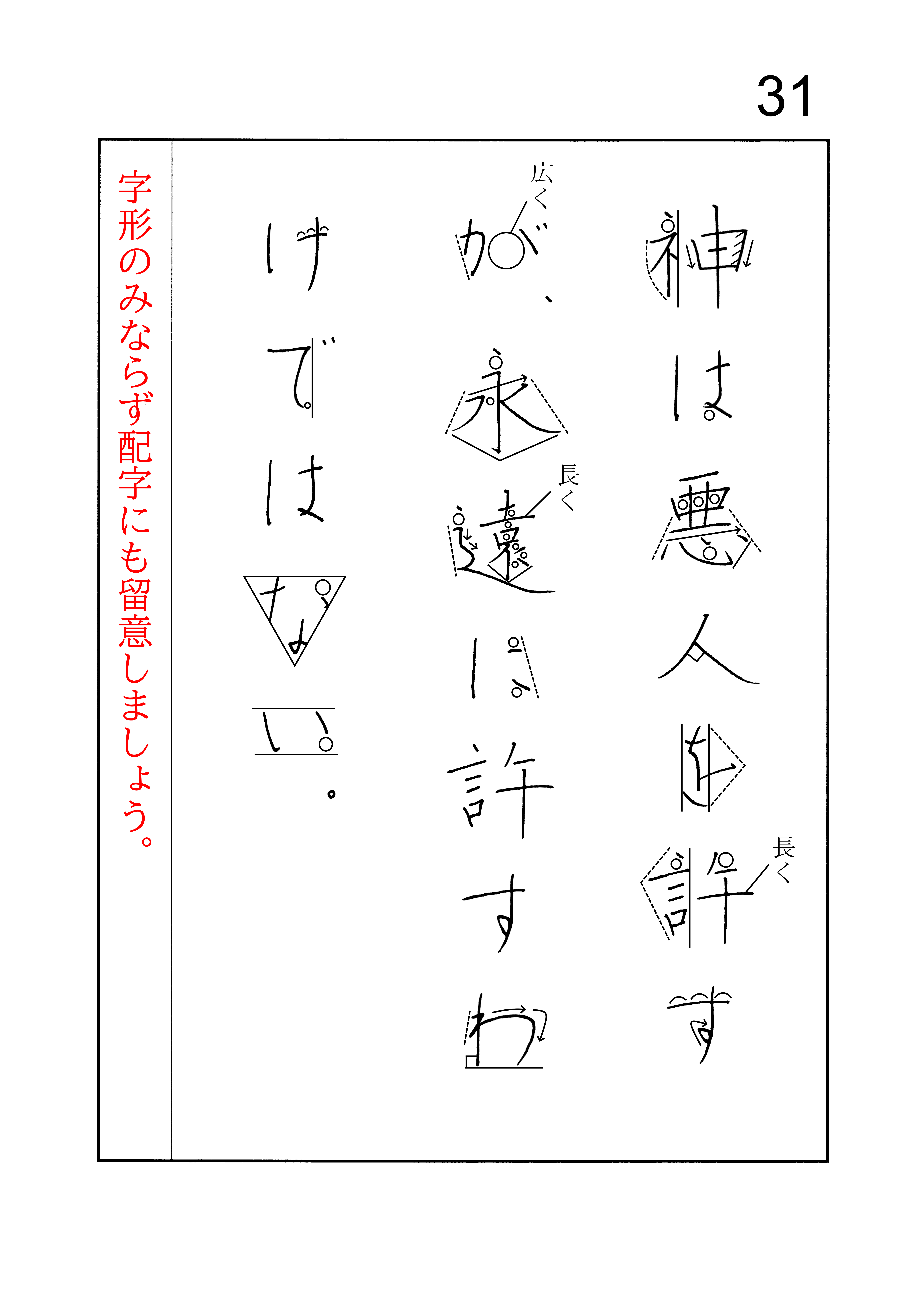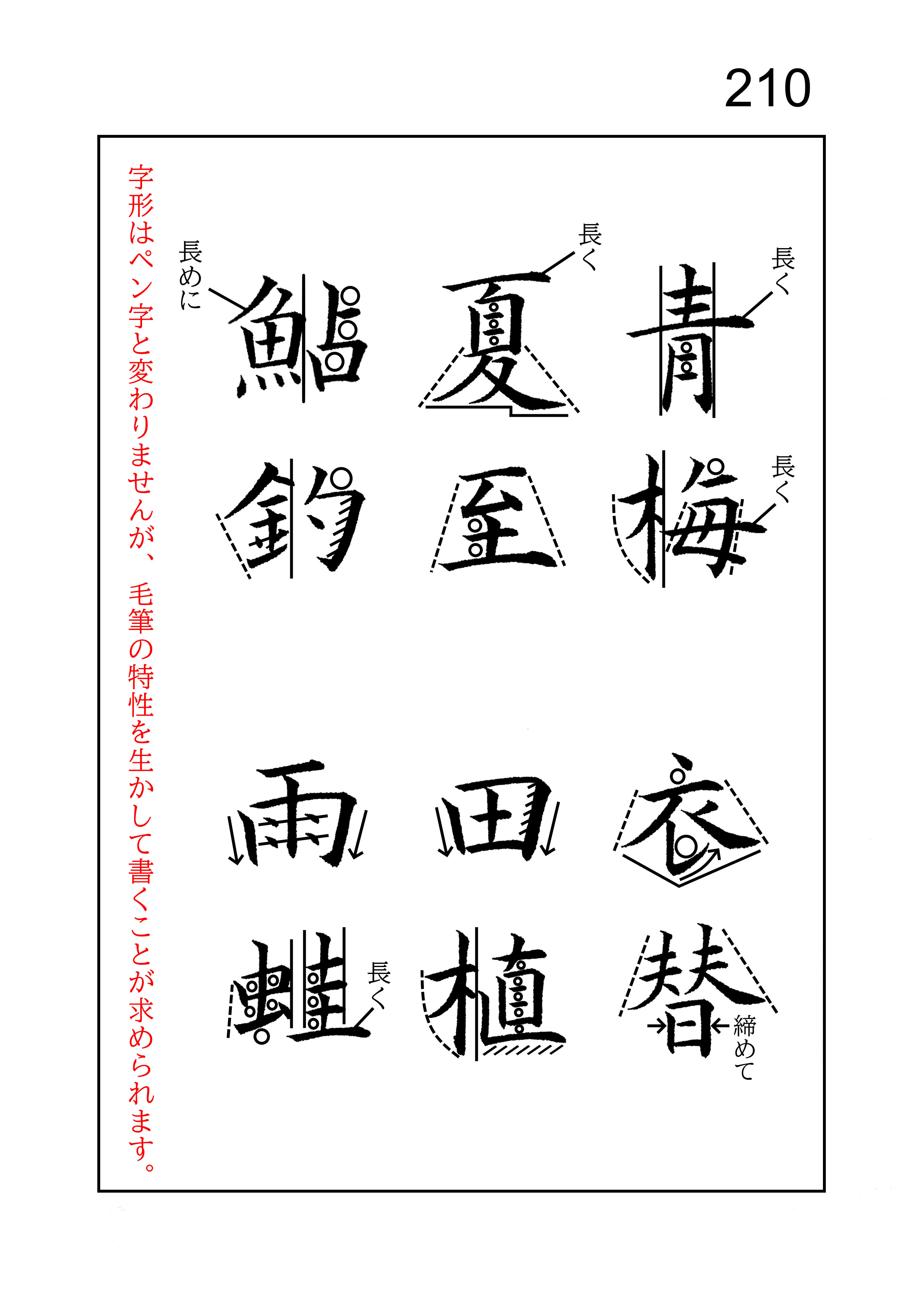 会員ページ RESULTS 審査結果 2025年12月作品審査結果 | 2026年1月15日 | 審査結果 2025年11月作品審査結果 | 2025年12月14日 | 審査結果 2025年12月号審査結果 | 2025年11月14日 | 審査結果 2025年11月号審査結果 | 2025年10月15日 | 審査結果 2025年10月号審査結果 | 2025年9月18日 | 審査結果 1 2 3 … 7 Next › EXCELLENT WORK 優秀作品 2025年12月出品優秀作品 | 2026年1月15日 | 優秀作品 2025年11月出品優秀作品 | 2025年12月15日 | 優秀作品 PROMOTION EXAM 昇格試験 昇格試験は、年2回(春・秋)実施している有料試験です。 月例競書作品審査の相対評価と違い、受験者の実力を絶対評価で認定します。 段位以上の資格取得には受験が必要ですので、ご承知おきください。 2026年前期試験要項は3月下旬に掲載 HOW TO LEARN 手本の習い方 作品評価の3大要素は、➀字形 ➁配字 ➂線質 です。 線質の向上には年月を要するため、まずは字形・配字の安定に注力してください。 配字とは、字間・行間・行の流れに留意し、紙面への収まりを良くすることです。 好印象を与えるためには、字形のみならず配字にも気を配りましょう。 初学者用の補足画像をご用意していますのでご覧ください。(1級までの手本対象) ペン字【手本番号1~38】 1 2 3 4 5 6 7 8 9 10 11 12 13 14 15 16 17 18 19 20 21 22 23 24 25 26 27 28 29 30 31 32 33 34 35 36 37 38 毛筆細字【手本番号201~224】 201 202 203 204 205 206 207 208 209 210 211 212 213 214 215 216 217 218 219 220 221 222 223 224